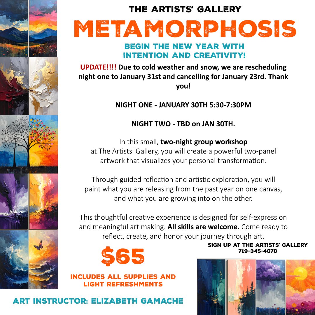 Elizabeth Gamache will teach a two-night group workshop; students need to commit to attending both nights, January 23rd and January 30th from 5:30- 7:30pm. She will instruct students in making a two-panel artwork entitled “Metamorphosis”. In Class one, the canvas panel represents what the student is releasing from the past year, and in Class two the panel represents what the student is growing into in the New Year. The class is $65 and limited to ten (10) participants; all supplies and light refreshments are furnished.