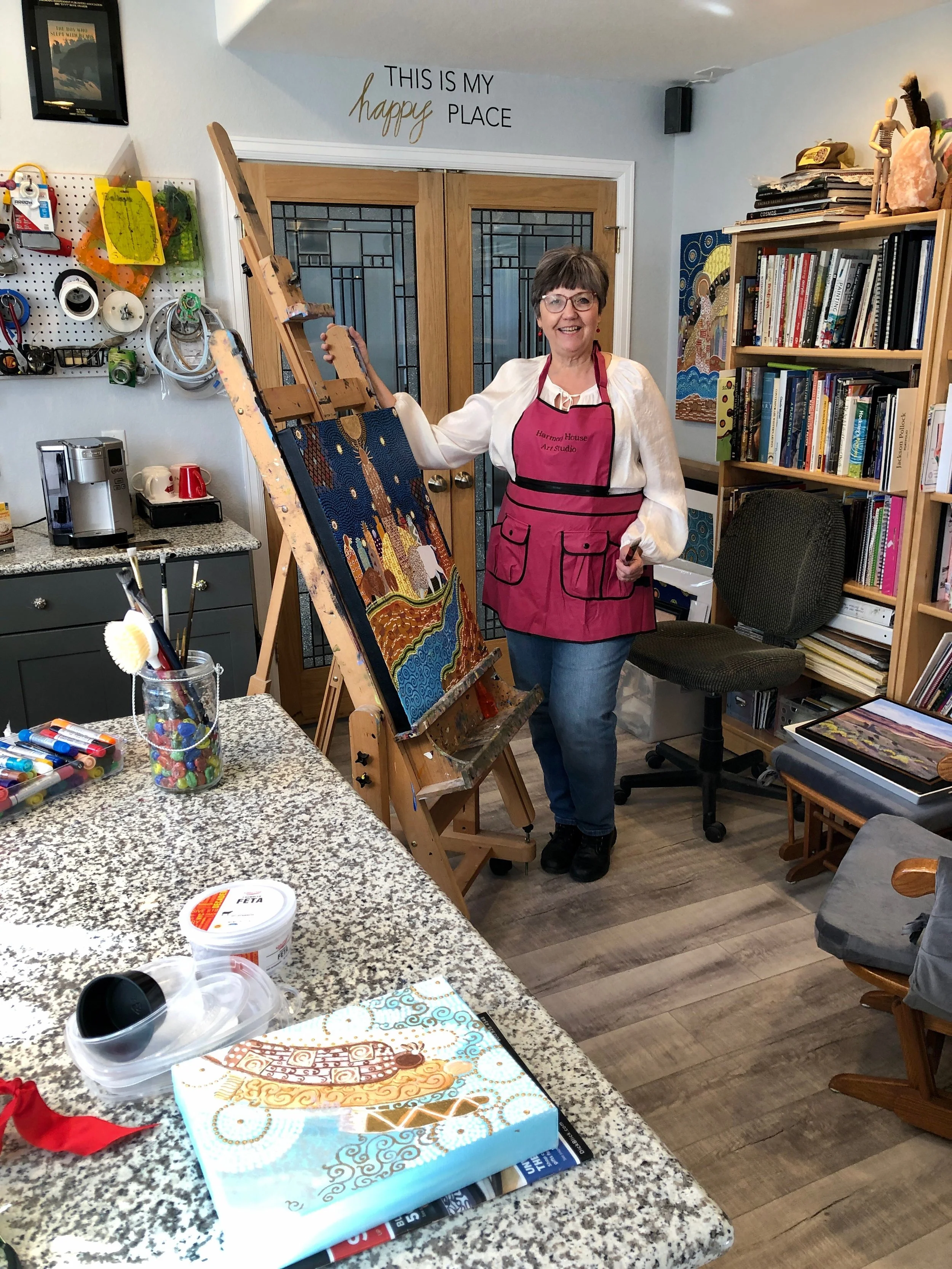 When I step into my studio, I consider it a holy place where anything can happen. I believe my work is guided and when I listen and respond accordingly my work flows through me and onto canvas, paper, and sometimes into assemblages. Whatever the creation, it feels powerful and healing in many ways. Each color, symbol, and certain items in my images are intended to have deep meanings and messages for the viewer. I believe that each of my paintings has their own spiritual energy and will connect with the right person at the right time in their lives. When they see it, they will know it was painted just for them.