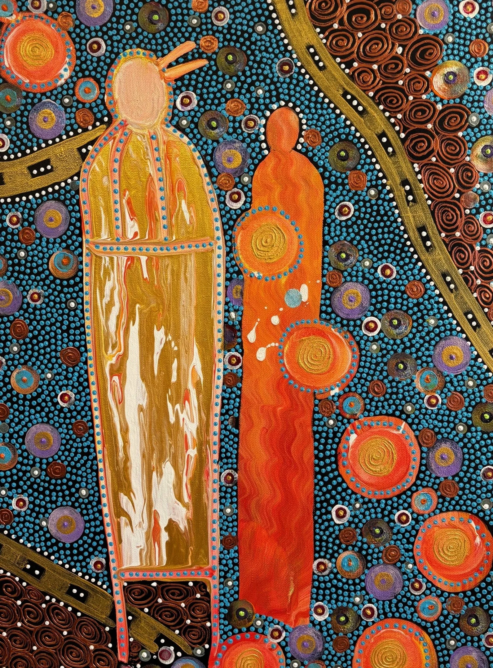 The process of creating any kind of artwork is a spiritual process for me. I love that I can step into a world filled with symbolism and cosmic matter through a variety of mediums and styles of art—realistic landscapes, modern abstract expressionism, and very spiritual figures. I like to call them Ancestors. My experiences collaborating with indigenous communities have helped me find a deeper connection to the past, present, and future through prayer and meditation. In many indigenous cultures around the world, rock art and petroglyphs helped ancient artists express themselves while recording their stories into the rock walls of canyons and caves. Lines, dots, and natural pigments from the Earth help tell the story of their connection to the natural and spiritual worlds where all things are connected.